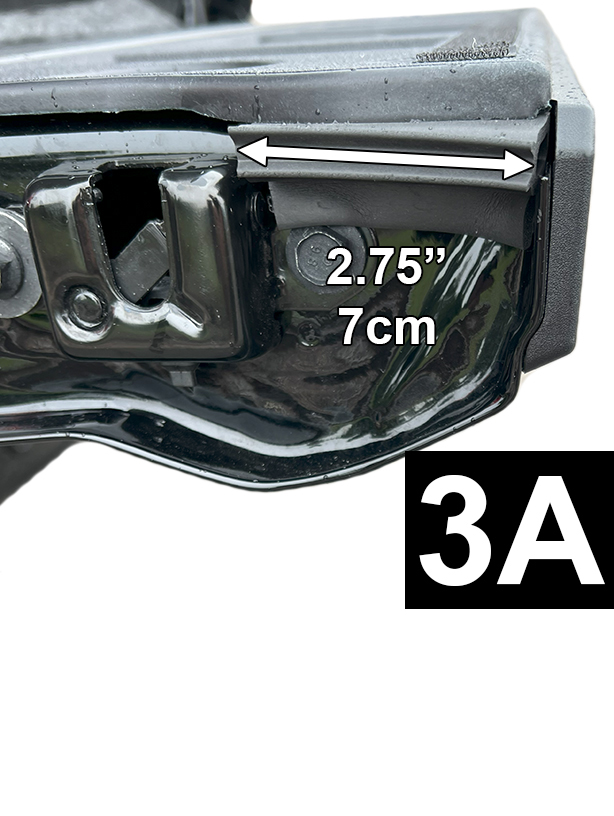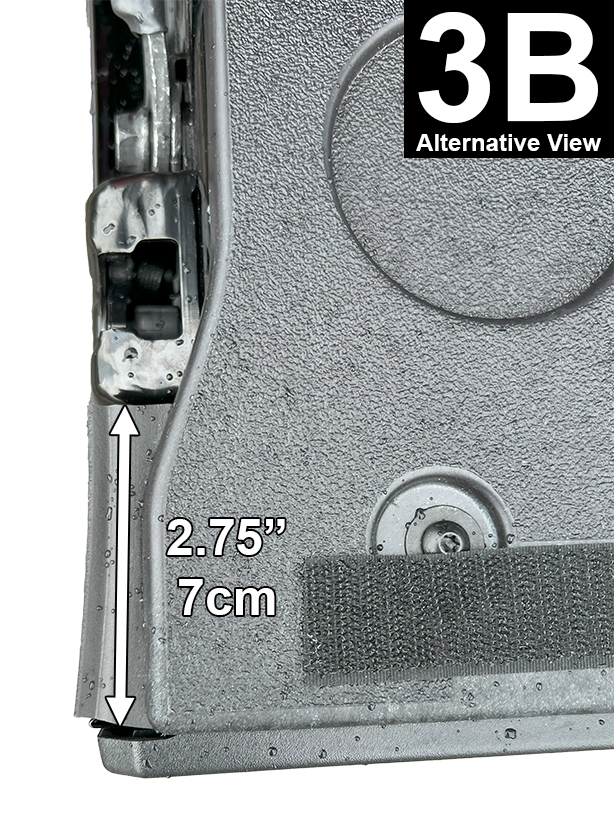 Cut a 2.75” (6.98 cm) piece of Large Tailgate Seal. Remove liner and attach to the side of tailgate at the top, bulb side facing upwards (FIG 3A and 3B). Apply light pressure to adhesive. Close tailgate. If you see light through the sidewall, make adjustments by removing seal and repositioning. NOTE: For smaller gaps substitute Large seal with Standard seal and apply either bulb side up or bulb side down. Do not apply firm pressure to adhesive. Duplicate for right side.