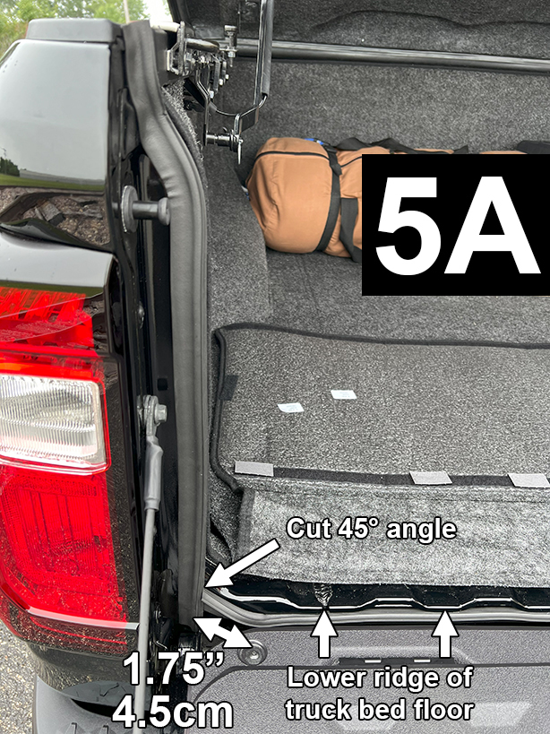 BEGIN: Cut a 45 degree angle in seal. Starting on the left side remove a section of liner and flush to seal on the sidewall (FIG 2 and 5A). Angle 45 degrees down from sidewall, approximately 1.75”, until horizontal with the lower ridge of truck bed floor. The flat top of seal should be flush with the bottom of truck bed floor lip. Attach in sections, apply light pressure to adhesive should you need to reposition. Stop when 12” from the right sidewall. Keeping adhesive off surface determine where seal will be flush with the seal on the sidewall. Cut seal at a 45 degree angle. Continue attaching. When approximately 1.75” from seal on the sidewall then angle up 45 degree, and flush to seal on the sidewall. Apply very firm pressure (25 lbs.) to secure adhesive bond.