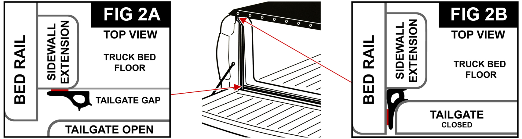 Start 1” (2.5 cm) below truck bed floor and attach seal to the rear corner edge of the left sidewall extension (FIG 2A). When nearing top of sidewall, gradually rotate seal 90° counter clockwise so that bulb side is facing inward and the taped side of seal is flush with the sidewall at the top (FIG 2B). Cut to fit. Apply light pressure to adhesive. Duplicate for right sidewall.