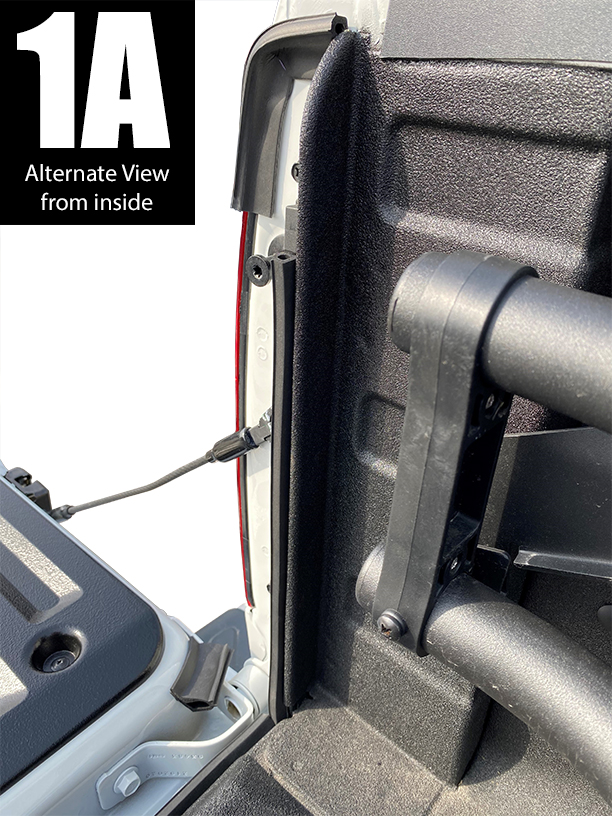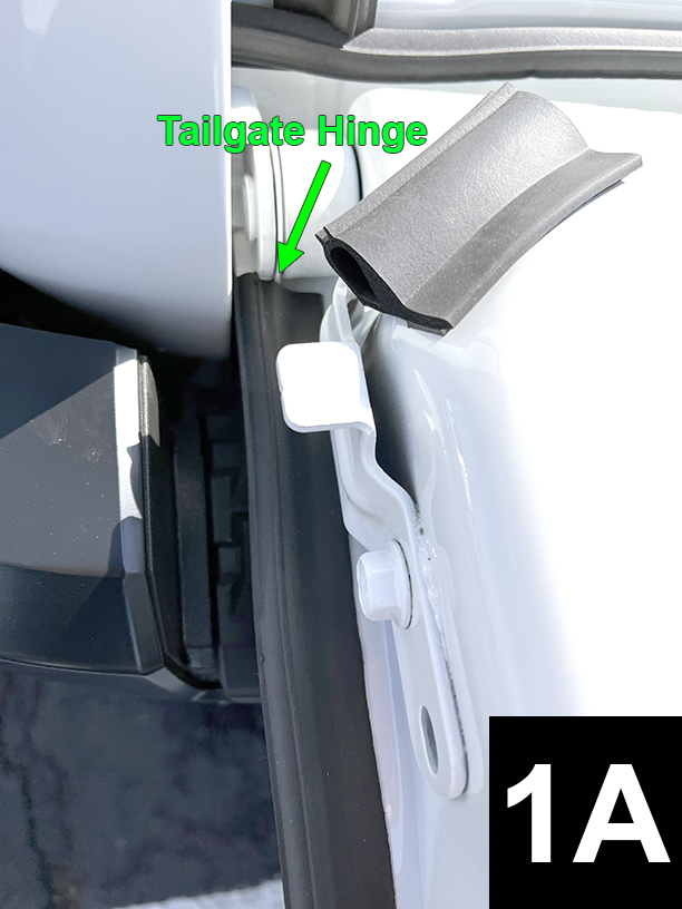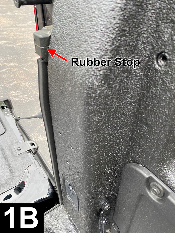 Start 1” (2.5cm) below truck bed floor and attach seal to the rear corner edge of the left sidewall extension (FIG 1A). Start from bottom and stop when flush the rubber stop (FIG 1B). Apply light pressure to adhesive. Duplicate for right sidewall.