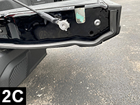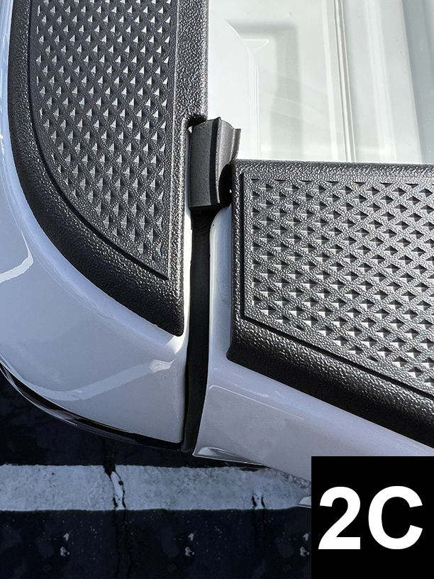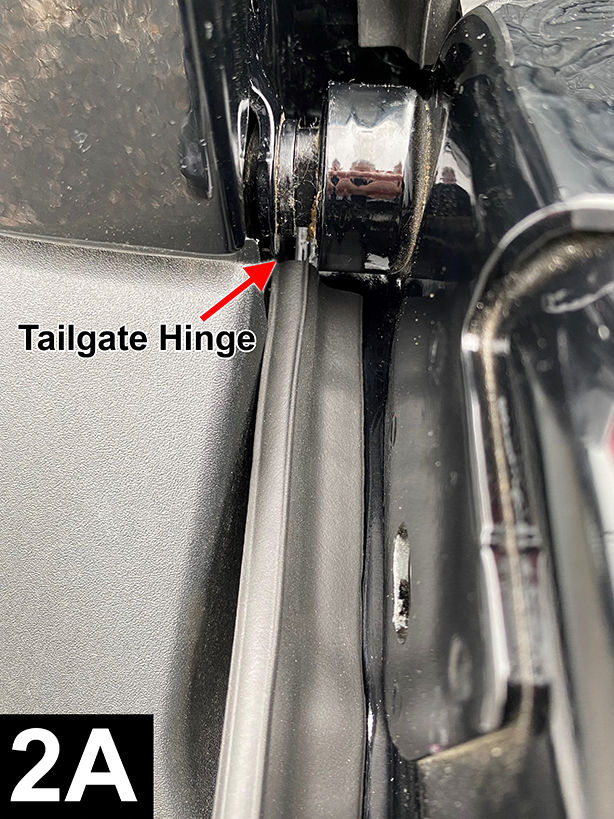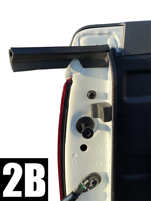 Lower tailgate. Cut a piece to 26” (66cm) from roll of seal. Remove adhesive liner completely and flush one end to tailgate hinge (FIG 2A & 2B). Apply light pressure to adhesive and continue upwards towards top of tailgate. Conform seal to curves and flush to the inside top of tailgate (FIG 2C) and cut to fit. Check alignment of seal by closing tailgate and simultaneously viewing seal compression from the rear of tailgate. If you see light or the bulb part of the seal is rolling too much (making it difficult to close tailgate) then reposition bulb in sections, or entirely, by loosening adhesive and then repositioning. Duplicate for right side.