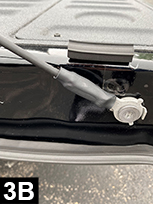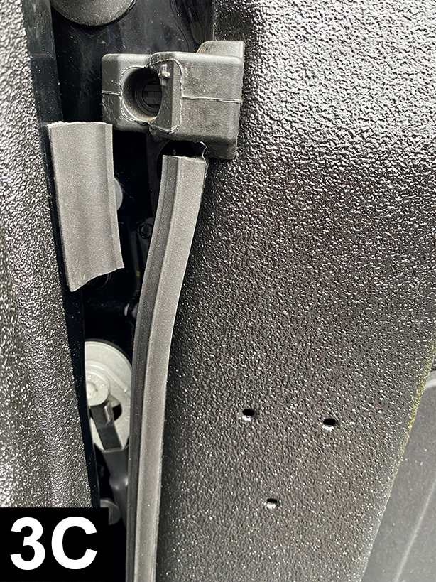 Cut a 2" (5cm) piece and attach to the top of tailgate, bulb side facing outwards (FIG 3A and 3B). Position so that the top of seal will flush with the bottom of rubber stop when closing tailgate (FIG 3C and 3D). Apply light pressure. Duplicate for right side.