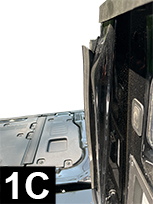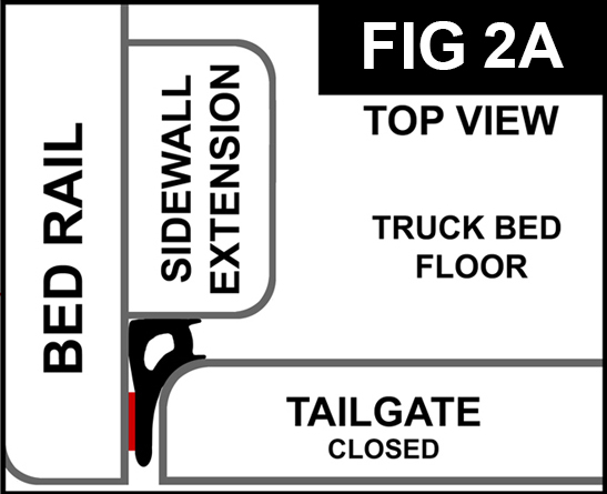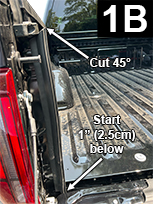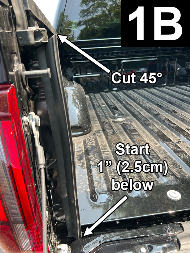 Start 1” below truck bed floor and attach Large Tailgate Seal to the rear corner edge of the left sidewall extension (FIG 1A, 1B and 1C) and apply light pressure to adhesive. Continue straight up, applying light pressure to adhesive and stop when 6” from the rubber stop. Keeping adhesive off surface, mark the seal where it will be flush to bottom of rubber stop. Cut at a 45° angle (FIG 1B). Continue up to rubber stop and apply light pressure to adhesive.