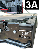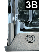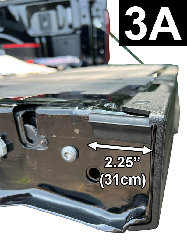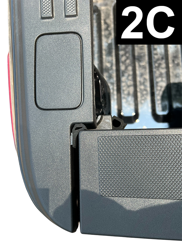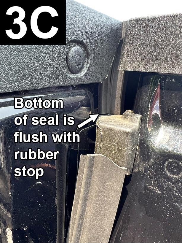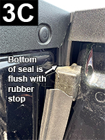 Cut a 2.25" (5.7cm) piece of Standard Tailgate Seal. Attach to the left side of tailgate and flush to the inside top of tailgate, bulb side facing up (FIG 3A and 3B). Apply light pressure. Check that bottom of seal does not interfere with rubber stop by lifting tailgate, but not closing and inspecting from the inside (FIG 3C). Adjust seal as necessary.