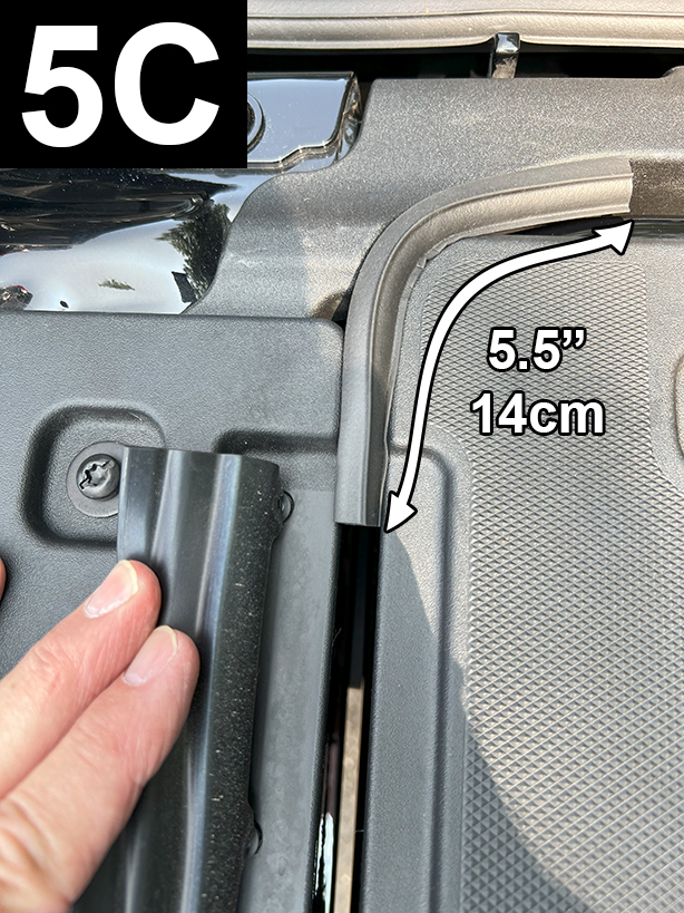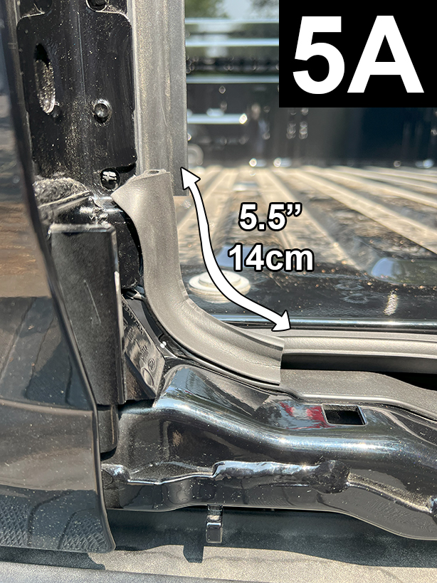 Cut a 5.500” piece of Standard Tailgate Seal. Determine position, before attaching seal, as shown in FIG 5A, 5B and 5C. Before removing liner and attaching seal, apply Adhesion Promoter to the non-painted surface.