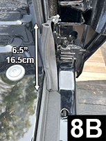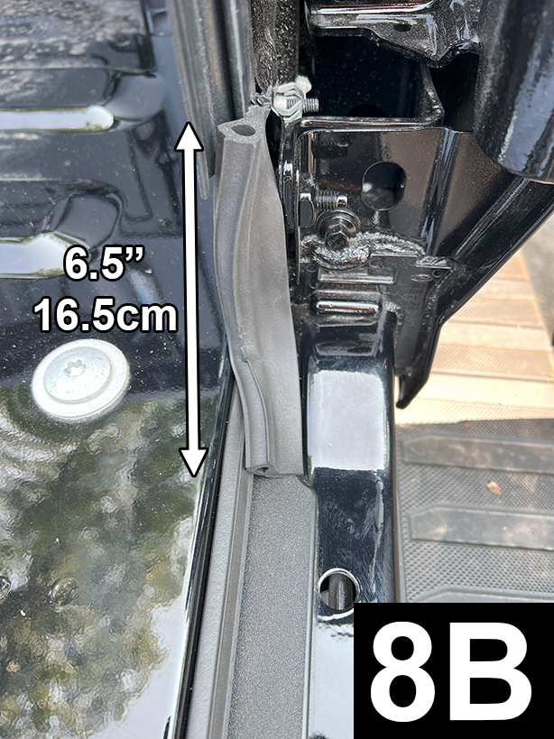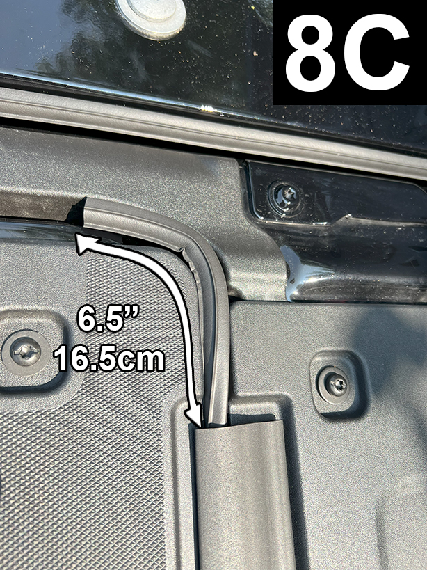 Cut a 6.500” piece of Standard Tailgate Seal. Determine position, before attaching seal, as shown in FIG 8A, 8B and 8C. Before removing liner and attaching seal, apply Adhesion Promoter to the non-painted surface.