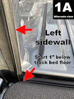 Start 1” (2.5 cm) below truck bed floor and attach seal to the rear corner edge of the left sidewall extension (FIG 1A). When nearing top of sidewall, gradually rotate seal 90° counter clockwise so that bulb side is facing inward and the taped side of seal is flush with the sidewall at the top (FIG 1B). Cut to fit. Apply light pressure to adhesive. Duplicate for right sidewall. |
