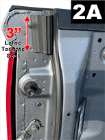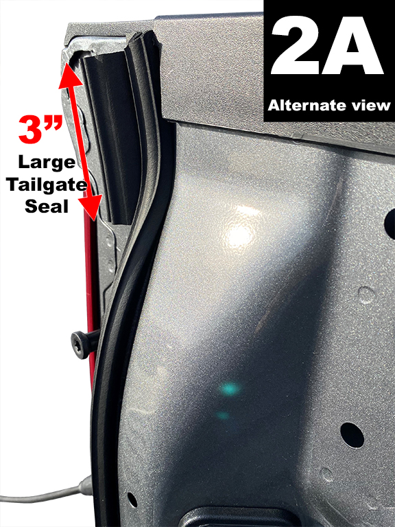 Cut a 3” (7.62cm) piece from the large 4.5” (11.43cm) length Tailgate Seal and attach just below top of bedrail (FIG 2A). Flush to the seal on the sidewall extension, bulb side facing inwards. |