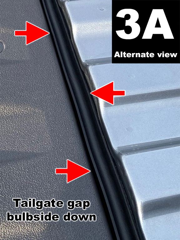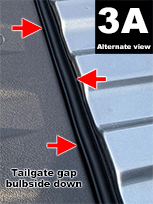 Position bulb side down and adhere to the tailgate gap just below the lower lip area of extended truck bed floor (FIG 3A).