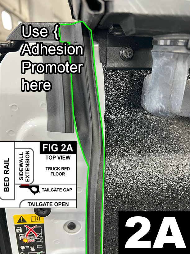 Put on protective glove and apply enclosed adhesion promoter to the side of plastic bedrail liner as shown in FIG 2A. Apply only to the area where the adhesive tape will secure. Allow 90 seconds to dry.