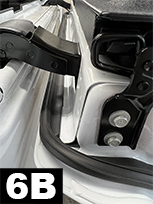 Open midgate. Peel back a section of liner and begin attaching Standard seal, with bulb side facing outwards and flat edge of seal flush to the inside corner of midgate (FIG 6, 6A and 6B). Attach in sections and apply light pressure to adhesive. Gradually round corner (slight ripples will exist at the corners and will not affect performance) and attach for entire horizontal length (FIG 6B). Gradually round corner on the other side and cut to fit. Once seal is positioned apply very firm pressure (25lbs.) to secure adhesive bond. |
