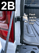 Start 1” (2.5 cm) below truck bed floor and attach seal to the rear corner edge of the left sidewall extension (2A). Continue up and flush seal to bottom of rubber stop and cut to fit (2B). Flush seal to top of rubber stop and continue up to top of sidewall. Cut to fit (2C). Apply light pressure to adhesive. Duplicate for right sidewall.