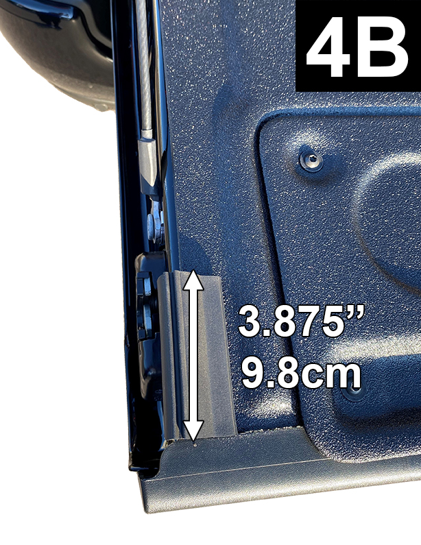 Measure distance from top of rubber stop to underside of rectangle shaped horizontal seal. Cut this length from piece of Large Tailgate Seal and position as shown in FIG 4B and 4C. Apply light pressure to adhesive. Duplicate for right side.