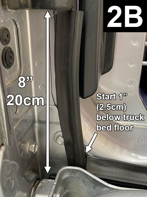Start 1” (2.5cm) below truck bed floor and attach seal to the rear corner edge of the left sidewall extension (FIG 2A). Continue up sidewall, approximately 8” (20cm) to rubber stop, flush seal to bottom of rubber stop and cut to fit (FIG 2B).