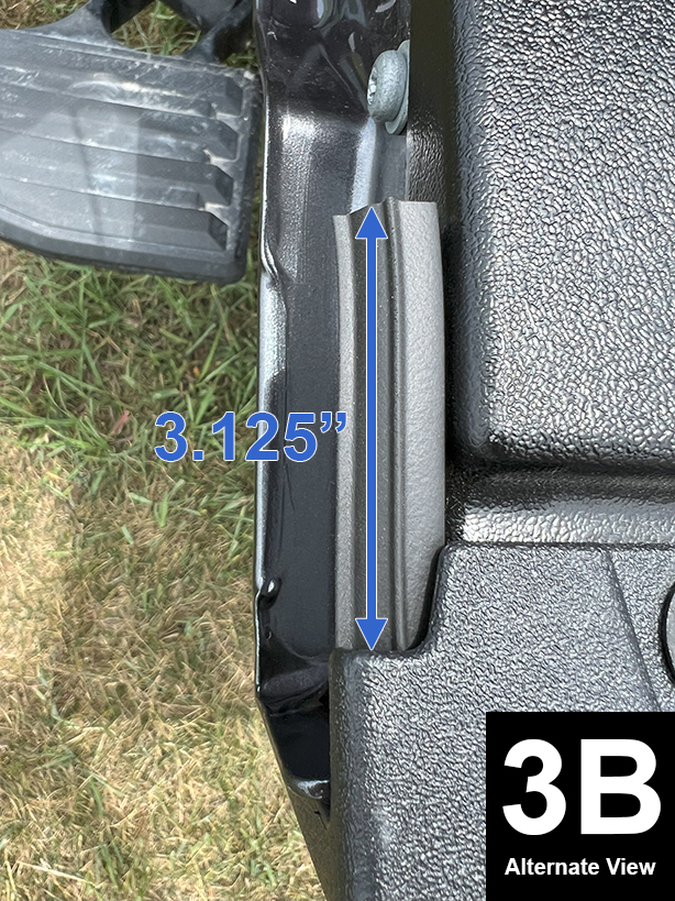 Cut a 3.125” piece of Standard Tailgate Seal. Remove liner and attach to the side of tailgate at the top, bulb side facing upwards (FIG 3A). Apply light pressure to adhesive. Close tailgate. If you see light through the sidewall, make adjustments by removing seal and repositioning. NOTE: For larger gaps substitute Standard seal with Large seal and apply either bulb side up or bulb side down. Once seal is positioned apply very firm pressure (25lbs.) to secure adhesive bond. Duplicate for right sidewall. |